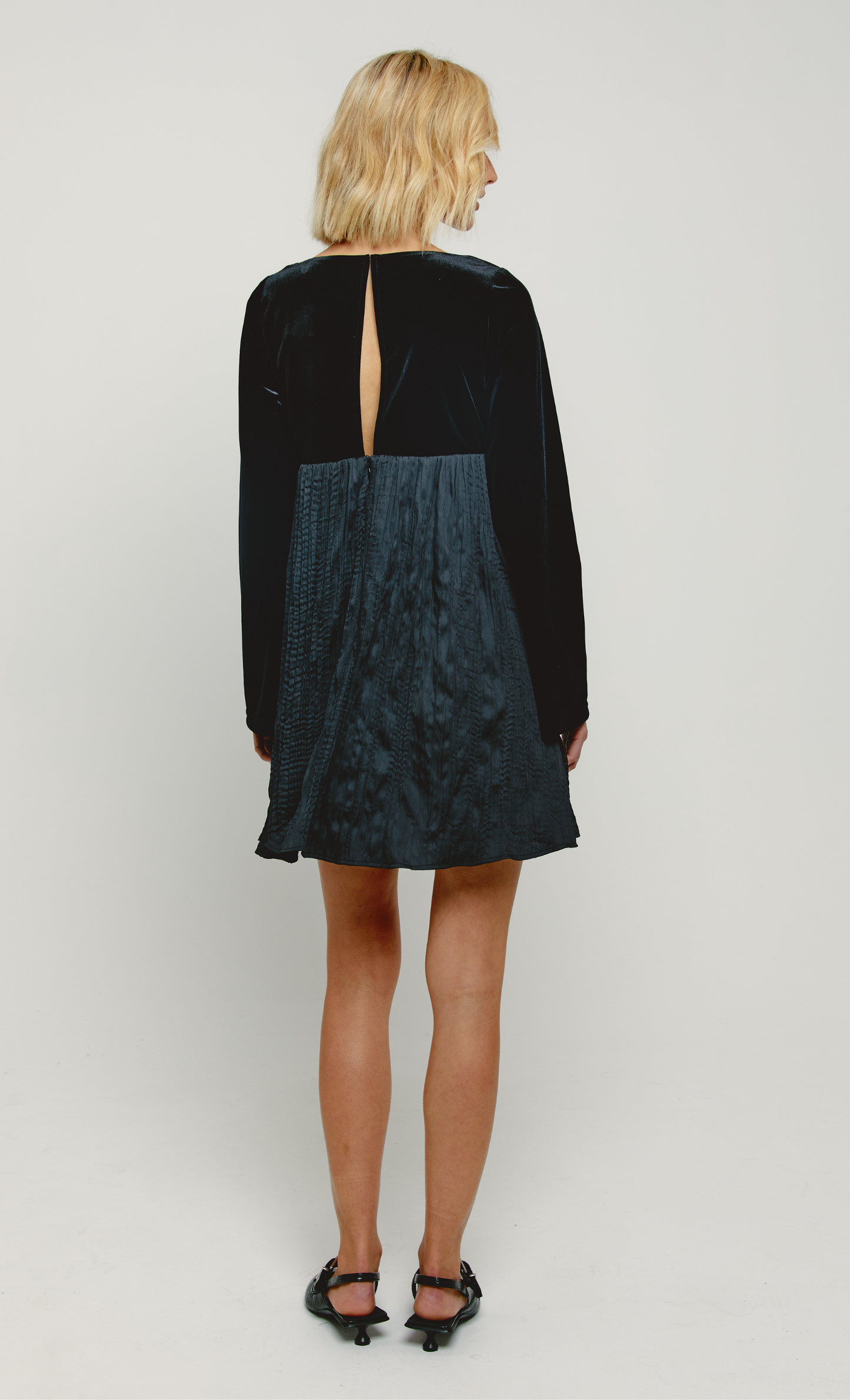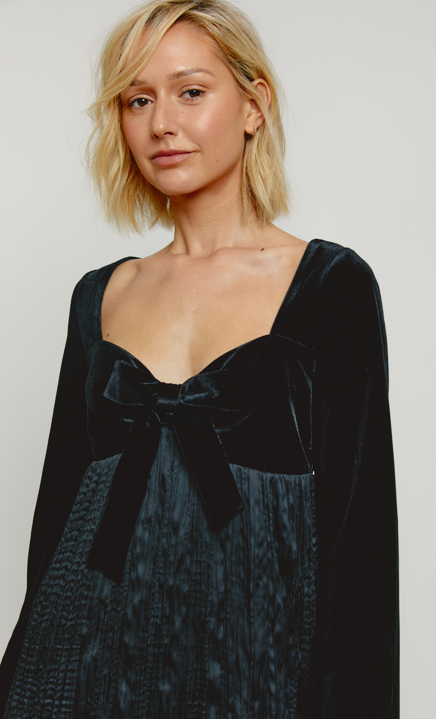Chic and charming, the Black Velvet Bow Mini Dress is your go-to for effortless party glamour. Crafted with a luxe mix of velvet and satin, it features a sweetheart neckline finished with a statement bow for a feminine touch. The A-line crinkle effect skirt adds playful movement, while long velvet sleeves balance the silhouette with a sleek edge.