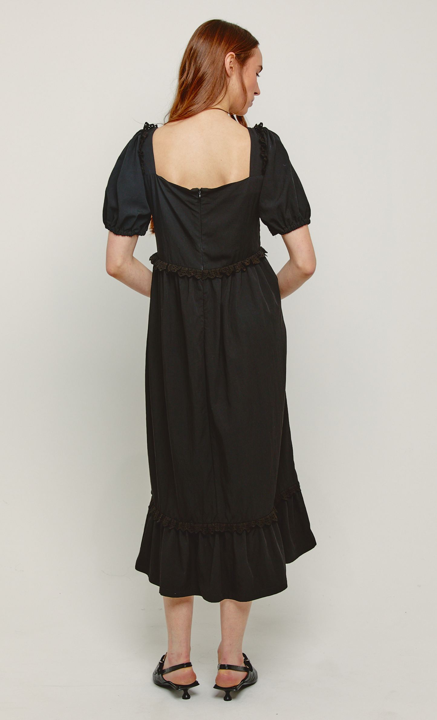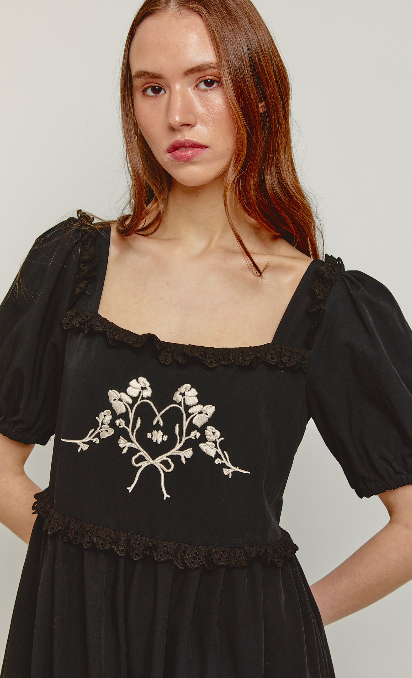 A romantic take on everyday dressing, the Embroidered Puff Sleeve Midi Dress features a square neckline, puff sleeves, and a flowing silhouette. The bodice is decorated with soft blush floral embroidery, while lace trim and a ruffled hem add an extra feminine touch. An elasticated waist ensures comfort while keeping the fit flattering.