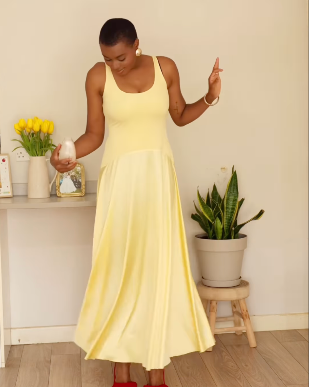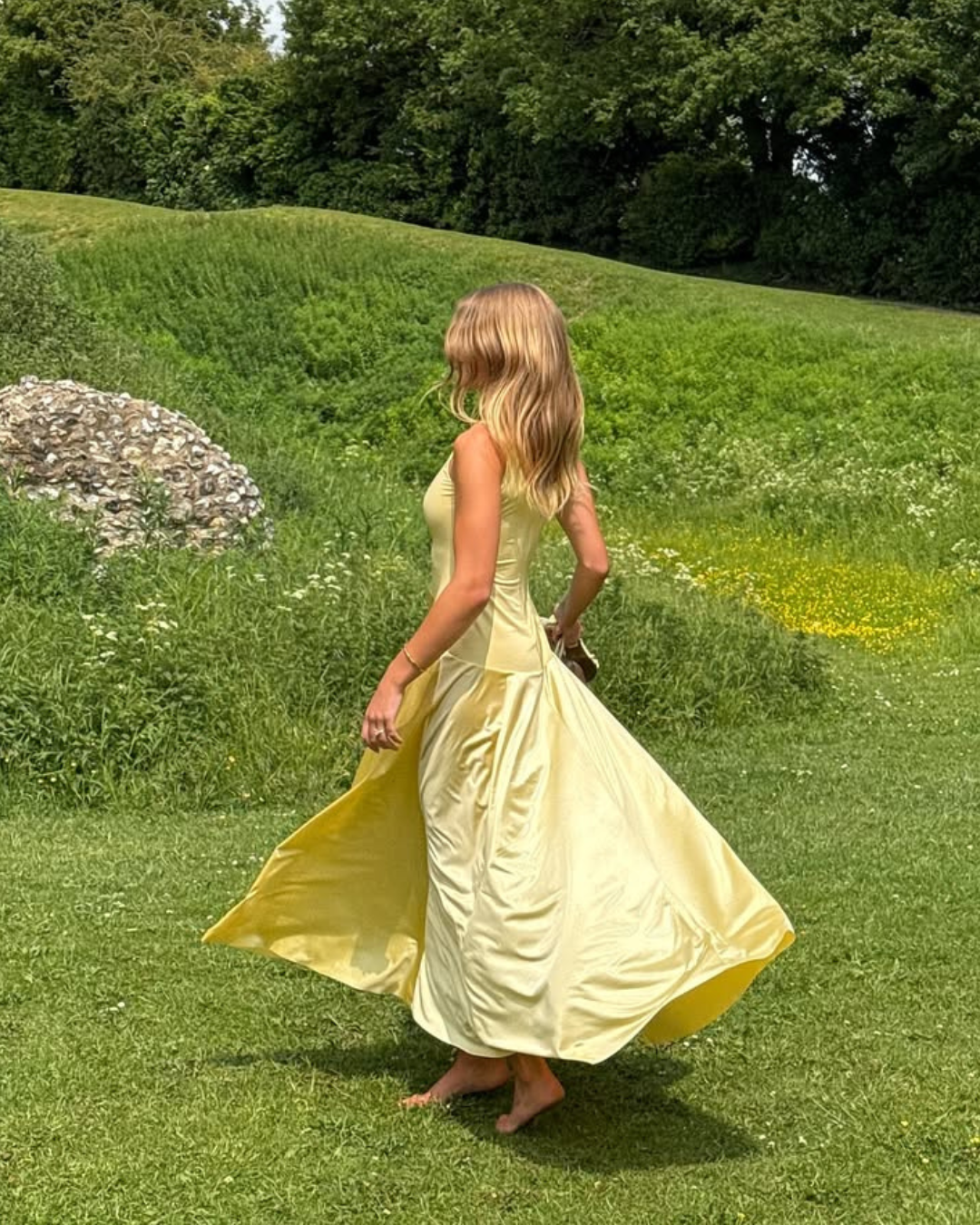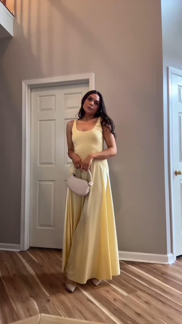 Make a statement in our Butter Yellow Curved Drop Waist Maxi Dress, the perfect blend of elegance and effortless style. Featuring a sleek, fitted bodice with a scoop neckline and delicate shoulder straps, this dress flows into a voluminous satin skirt for a graceful, ethereal silhouette.
