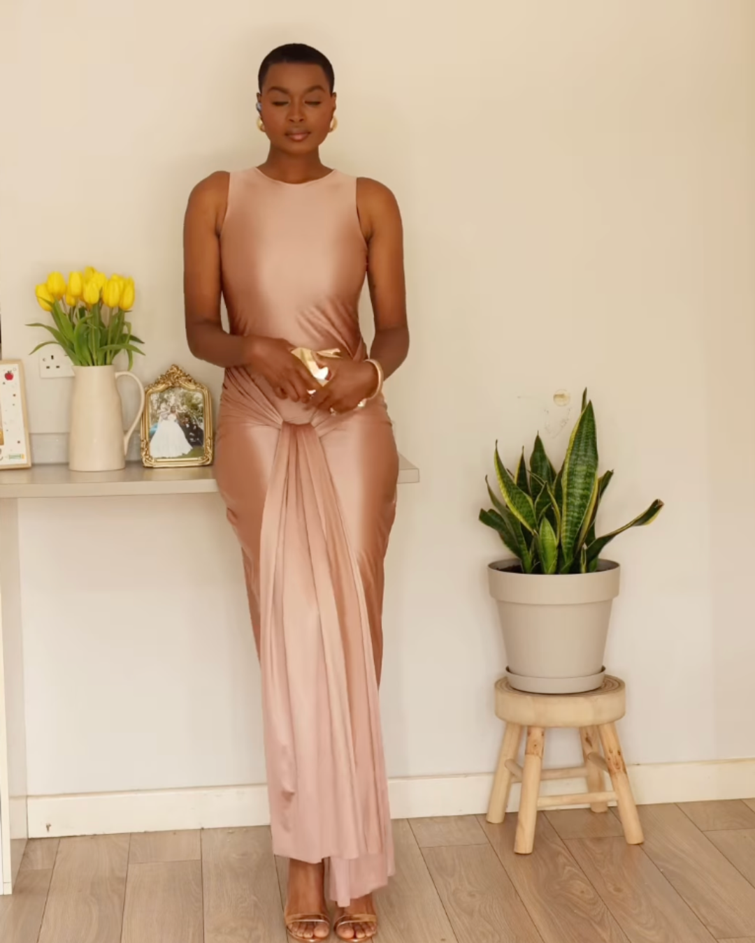 Effortlessly elegant and flattering, the Blush Liquid Jersey Maxi Dress is designed to turn heads at any occasion. Crafted from a luxurious liquid jersey fabric, this dress drapes beautifully over the body, offering both comfort and style. The adjustable tie detail at the waist creates a flattering silhouette, while the figure-hugging fit enhances your curves.