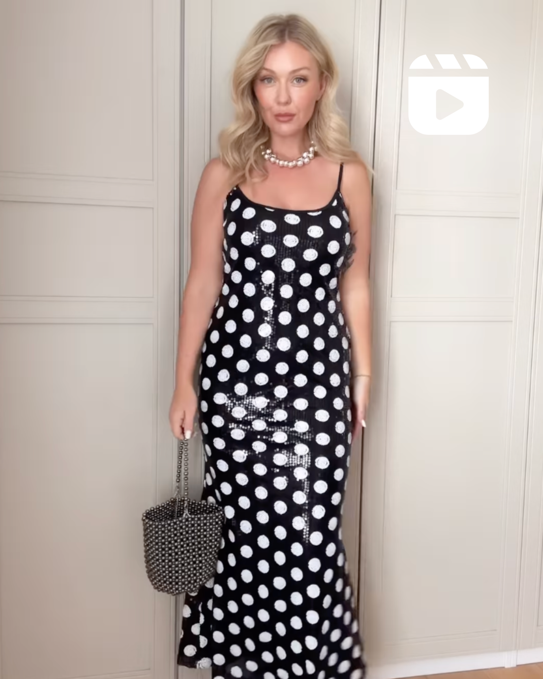 Shine all night in this Polka Dot Sequin Cami Maxi Dress. Designed with a body-skimming silhouette and delicate spaghetti straps, this dress is all about effortless glam. The White polka dot sequins pop against the black mesh base, catching the light with every move. Perfect for party season, date nights, or any moment that calls for a little extra sparkle.
