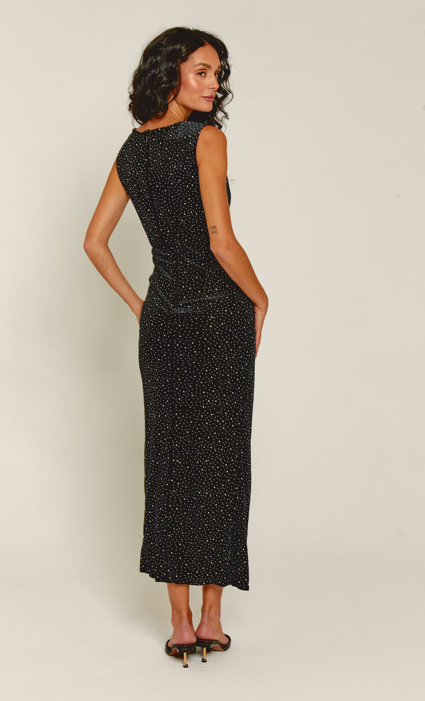 Black Gathered Diamante Velvet Dress