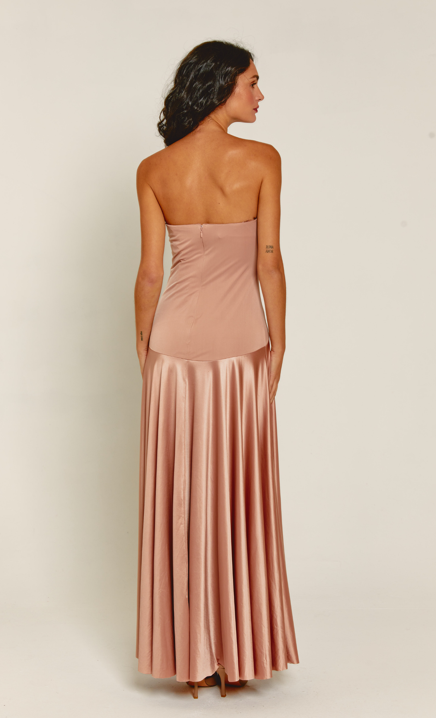 Romantic and refined, the Mauve Curved Drop Waist Bandeau Maxi Dress is designed in a soft mauve satin with a lustrous finish that feels both modern and timeless. The strapless bodice is cut to flatter, flowing into a dramatic curved drop waist that gives way to a full, floor-sweeping skirt. Lightweight with natural movement, it’s a statement style that pairs elegance with ease — perfect for weddings, formal events or special evenings.