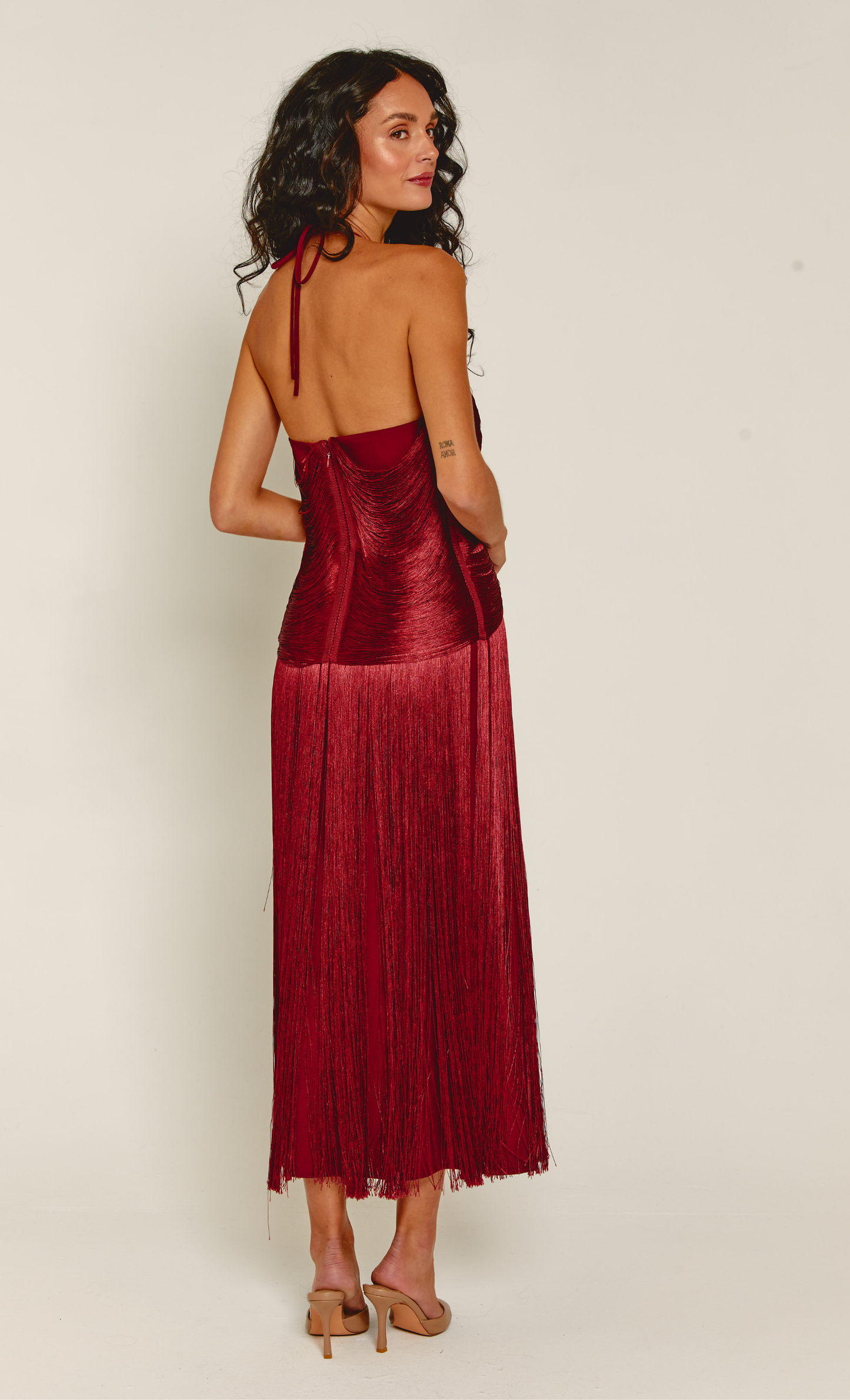 The Wine Halter Fringe Midaxi Dress is made for movement and unforgettable entrances. Designed in a rich wine hue, it features a sleek halter neckline and cascading fringe that sways with every step. The fluid silhouette drapes beautifully, catching the light for a look that’s both elegant and dynamic. Perfect for after-dark events, it’s the definition of modern glamour — bold, confident, and impossible to ignore.