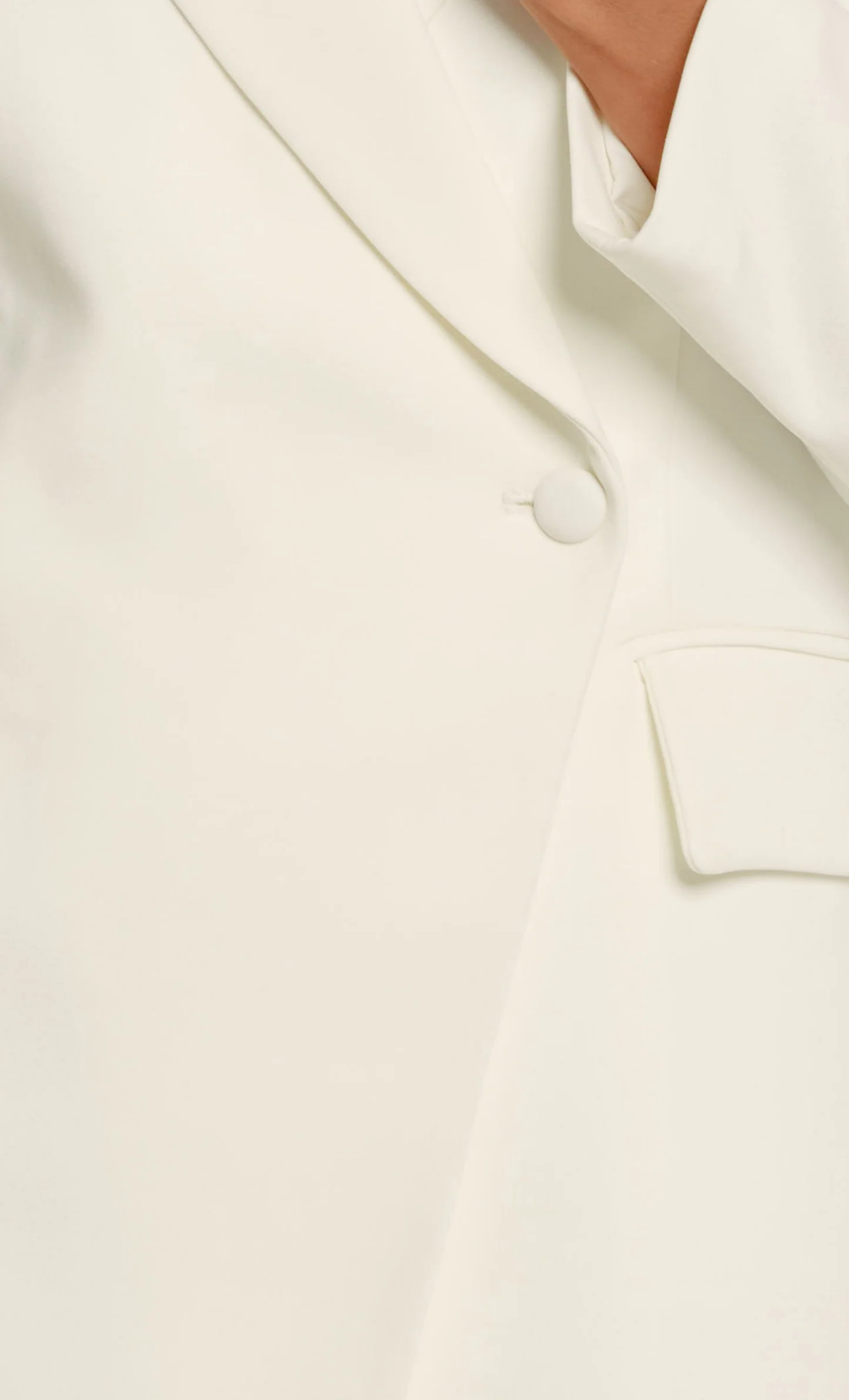 The Cream Wrap Front Tailored Blazer Mini Dress brings sophistication with a side of drama. Designed as a structured piece that defines the silhouette, it features sharp notched lapels and long sleeves for a clean, modern finish. A sleek single-button closure cinches the waist, while the unique curved hem and functional flap pockets add a contemporary touch to this timeless, power-dressing essential.