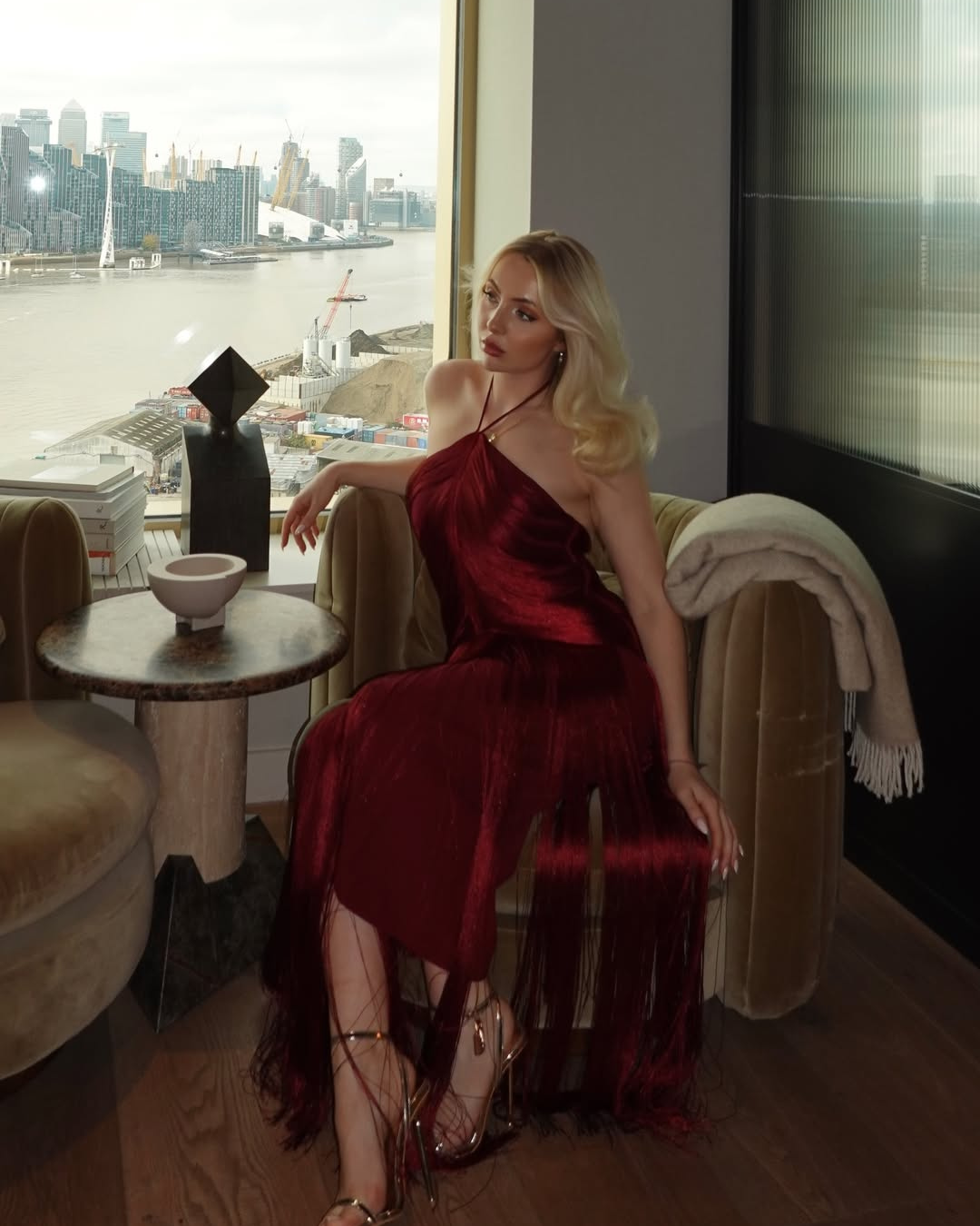 The Wine Halter Fringe Midaxi Dress is made for movement and unforgettable entrances. Cut in a rich wine tone, it features a sleek halter neckline and chevron-panelled bodice that flows into cascading fringe, swaying with every step. The fluid midaxi silhouette skims the body and catches the light for a look that’s elegant, playful, and impossible to ignore on the dancefloor.