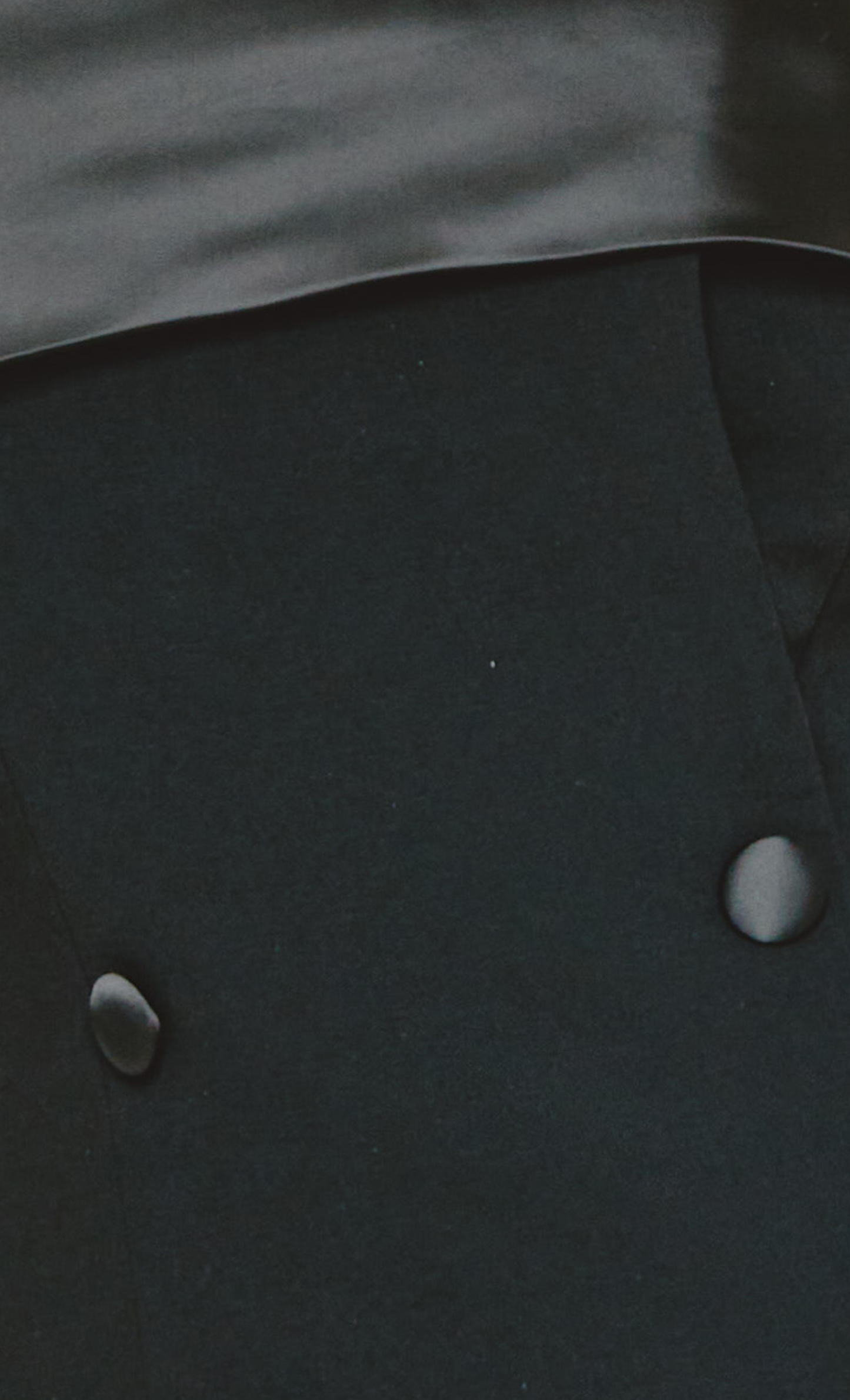 Sharp tailoring meets sleek glamour in the Black Tailored Satin Contrast Mini Dress. Featuring a satin fold-over neckline, double-breasted button detailing, and flap pockets, it channels a powerful yet feminine vibe. The fitted silhouette and mini length make it the ultimate after-dark statement piece.