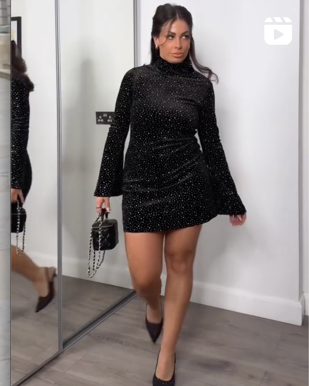 Introducing the latest addition to our diamante collection: our Velvet Mini Dress. This stunning piece combines the enduring appeal of velvet and flared sleeves that promise to add flair and drama to your gestures. This dress is designed to add sparkle to your wardrobe this season. Sparkles are multi-coloured in certain lights.