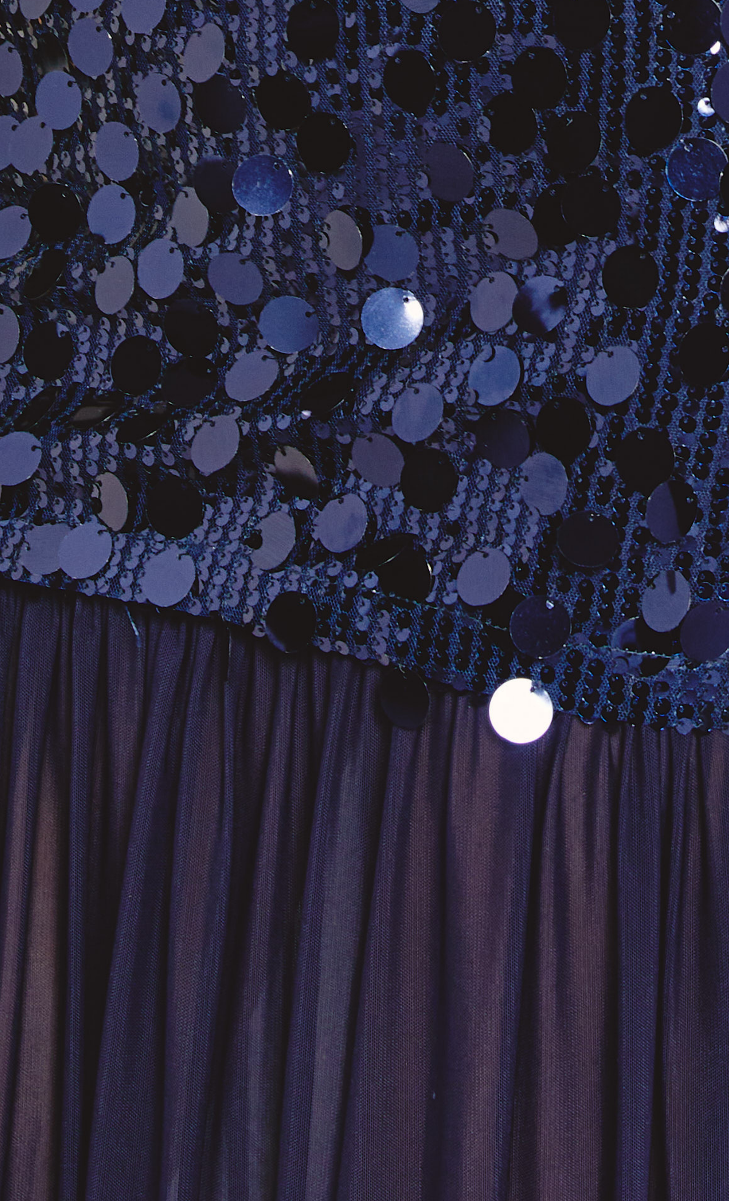 The Navy Sequin Mesh Skirt Maxi Dress is made for the kind of entrance you don’t forget. The fitted bodice is covered in oversized navy sequins that catch the light from every angle, while slim spaghetti straps keep the neckline clean and modern. Below, a sheer mesh skirt flows from mid-thigh to the floor with a soft, swishy movement, revealing a shorter lining underneath for just the right amount of drama. Glamorous, statement-making and still effortless to wear.