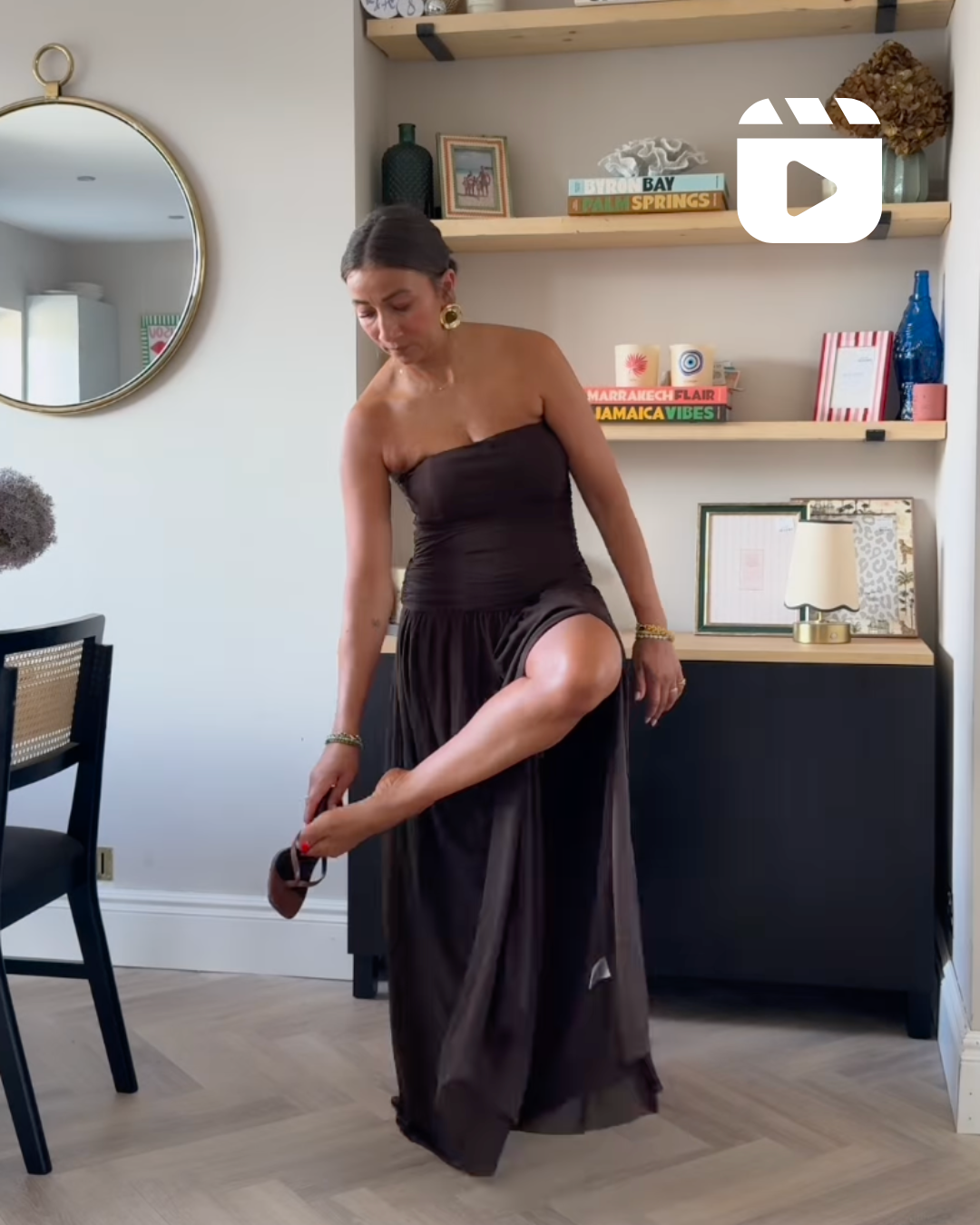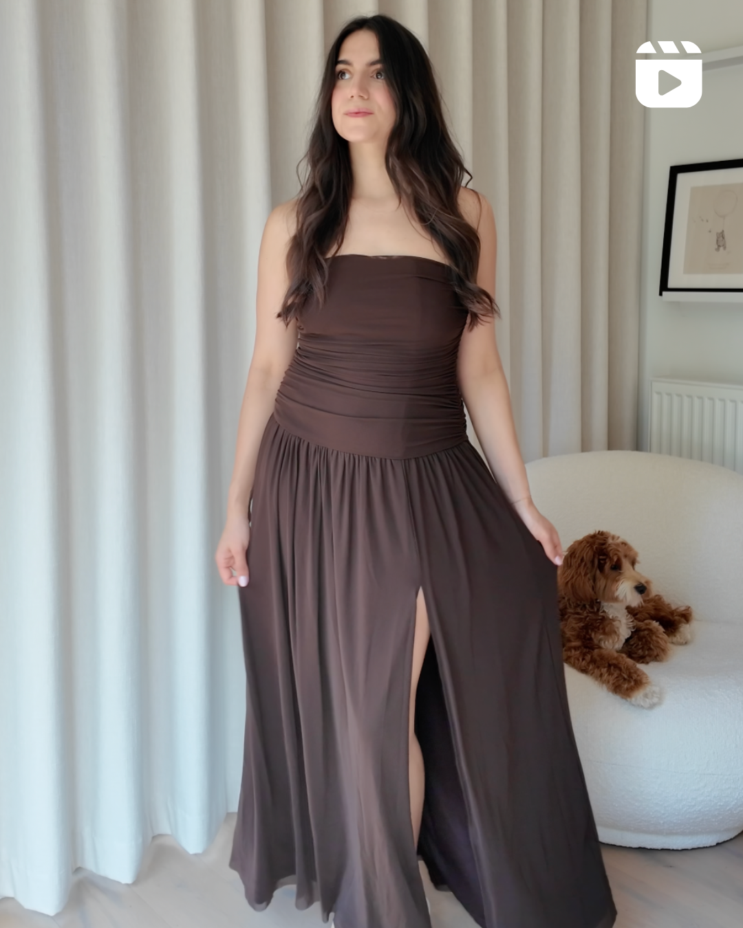 Simply Elegant, our chocolate brown maxi dress featuring a floor length pleated maxi skirt with a sultry split leg, the dress has a bandeau neckline and a drop waist with ruched detailing. The perfect style for a casual daytime look or evening event.
