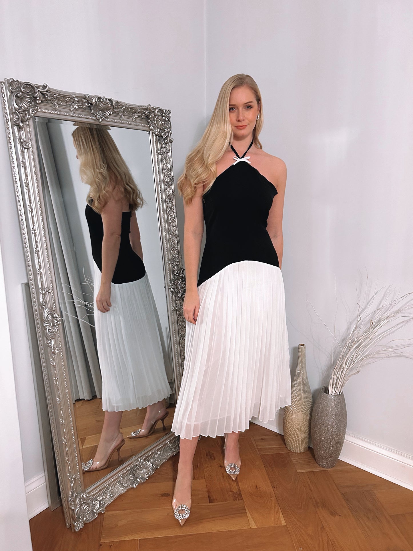 Regular price £47.50Sophistication meets contemporary design in our Drop Waist Pleated Midi Dress, a striking monochrome masterpiece. Featuring a sleek black halter neck bodice and a flowing white pleated skirt, this dress offers a bold yet elegant contrast. The drop waist design creates a modern silhouette that’s both flattering and effortlessly chic.