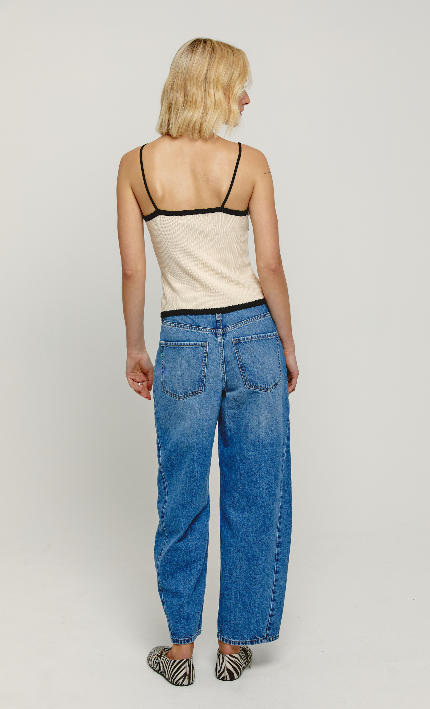 Cute and comfy. This cream knit cami features delicate black contrast trims and a playful bow tie under the bust for a sweet-meets-cool vibe. The soft stretch knit hugs the body just right, making it your go-to top for effortless day-to-night styling. Pair it with vintage denim or layer under an oversized blazer — it's a vibe either way.