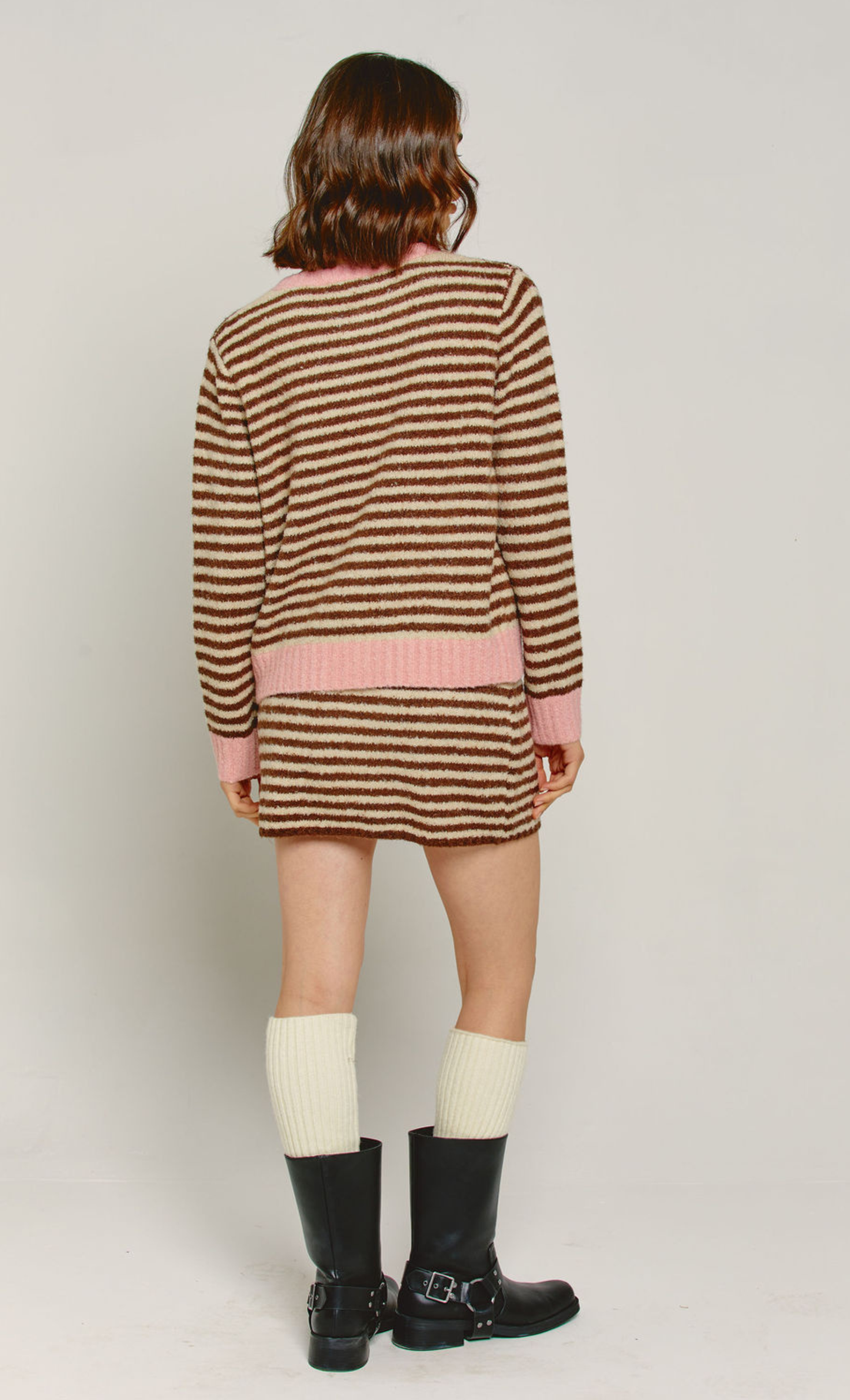 A playful update on a classic knit. Our Brown & Pink Stripe Knit Cardigan features cosy brown and cream stripes with contrast pink trims for a sweet, retro-inspired finish. Designed in a soft-touch knit with pearl-style buttons and a slightly relaxed fit, it’s perfect for layering or styling as a top on its own. Pair it with the matching mini skirt for a coordinated moment that feels both nostalgic and fresh.