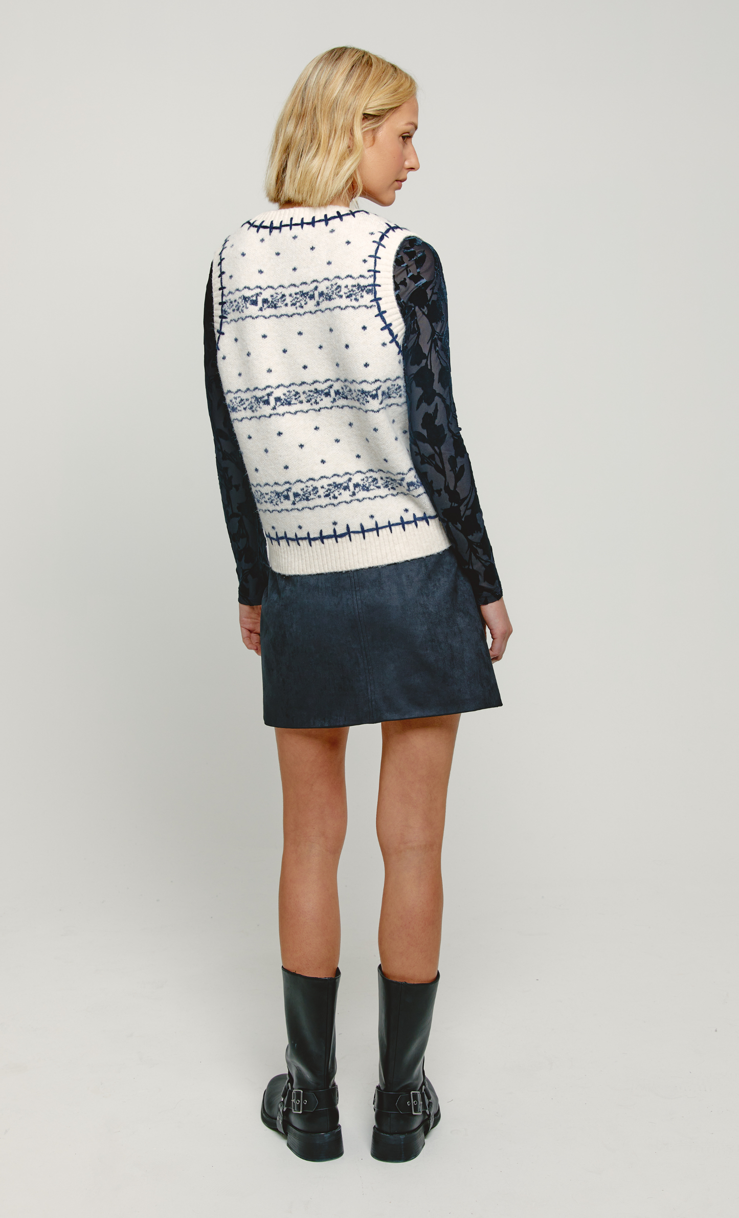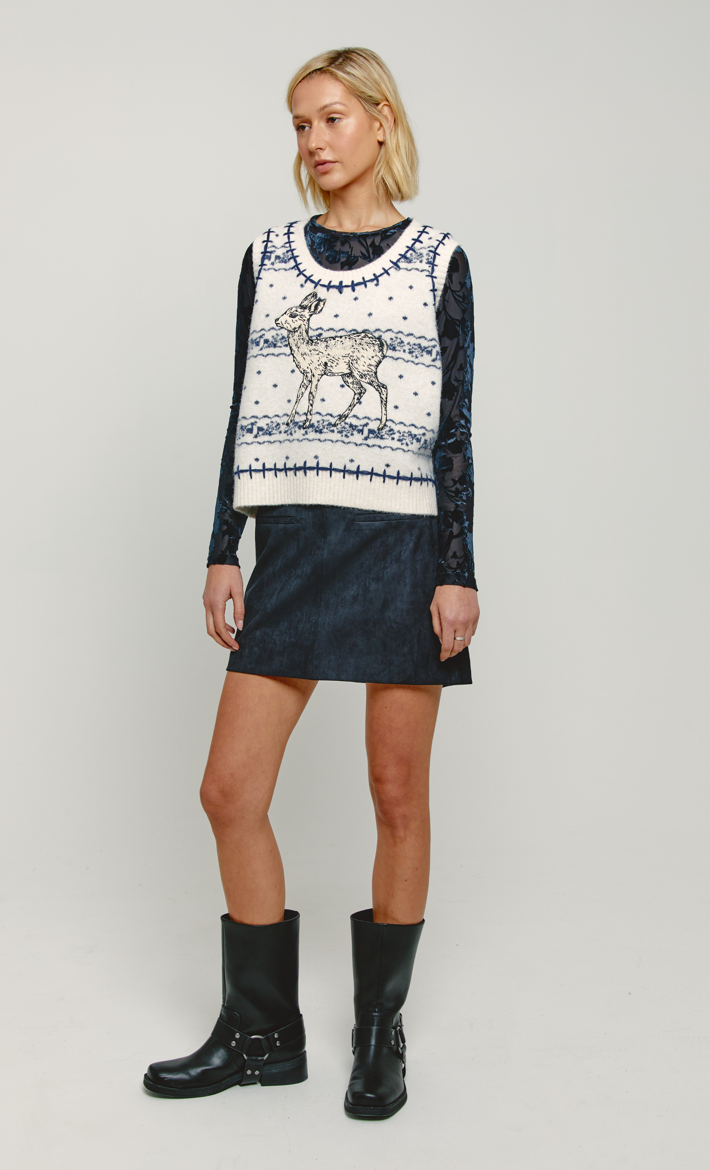 Soft, nostalgic and effortlessly charming. Our Cream Doe Fair Isle Knitted Vest Top features a delicate blue Fair Isle-inspired pattern with an illustrated doe motif at the centre — a sweet nod to vintage winter knits. Designed in a cosy cream yarn with contrast stitch detailing around the neckline and hem, it offers a relaxed fit perfect for layering.