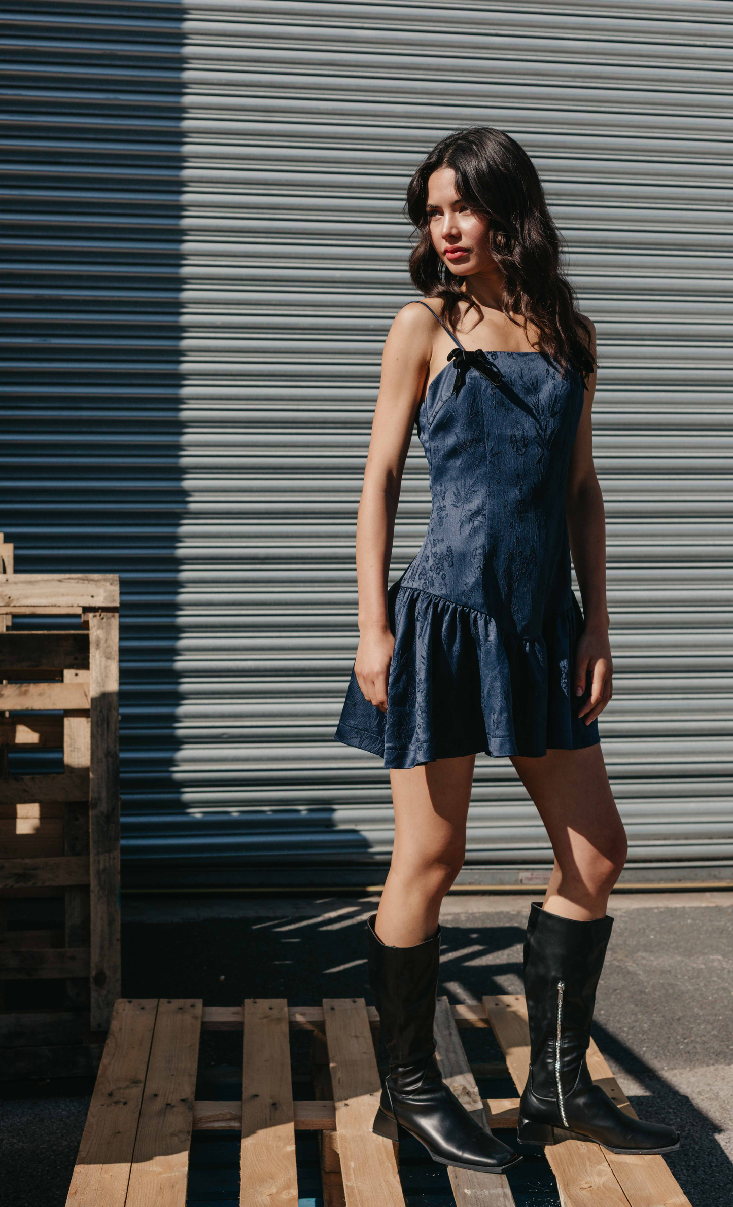 The Navy Jacquard Velvet Bow Dress blends a fitted bodice with a soft, flared hem for an easy, flattering shape. Crafted in rich satin jacquard with a subtle floral weave, it’s finished with velvet bow straps and a gentle sheen that catches the light. The mix of texture and movement gives it a playful, polished feel — a go-to piece for nights out, parties, and any moment that needs a touch of glamour.